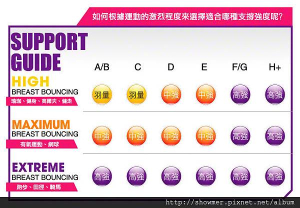 原廠針對這個問題,綜合了運動總類強度與胸部的尺碼(罩杯)做出了個對照表