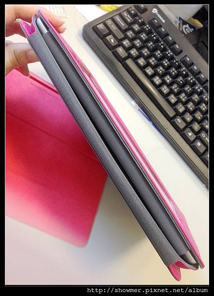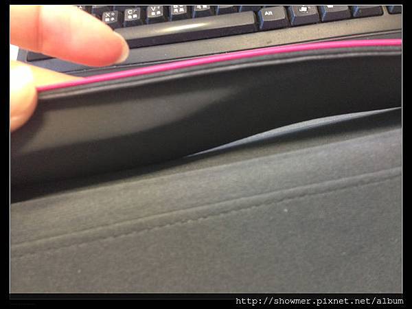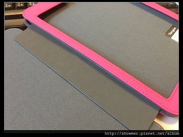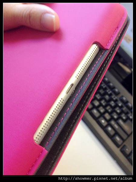 打開掀蓋~~~可以見到與 iPAD AIR 結合的方式是包覆式的,平板從前後蓋的連結處放入。放入處有縫上一塊止滑布片