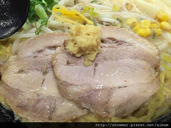 肉片上有一團薑末~~拌入麵中吃更提升了味噌湯頭的濃郁