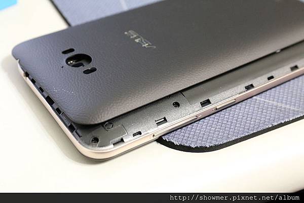 被蓋採用的是向 Zenfone Zoom 看齊的仿皮革材質