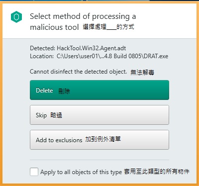 萬一有掃到東西,而且無法解毒,會詢問你要刪除或是略過,如果是誤判也可以加到例外清單(排除)。