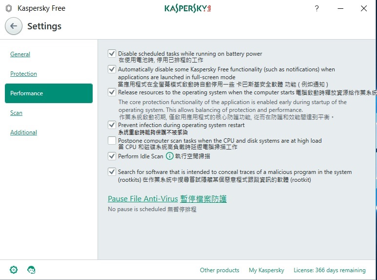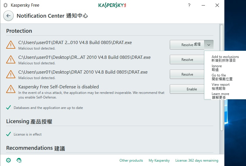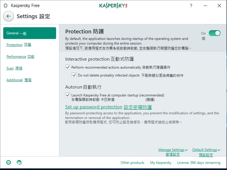 卡巴斯基免費版的版本為卡巴斯基2018,目前介面看起來只有英文,免費版開放的功能為即時防護、手動掃描、排程掃描、自動病毒碼更新、流量監控(網路防護)、郵件與即時通訊軟體防護,除了本地病毒庫外也能加入KSN去強化偵測能力(可自由選擇是否加入),雖然有些人批評沒有主動防禦功能不值得裝,但我認為對一般使用者來說,防毒軟體顯示訊息框的次數越少、自動化處理的程度越高越好,況且如果功能都開放了要怎麼賣錢,我認為卡巴斯基已經非常有誠意了。