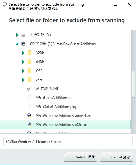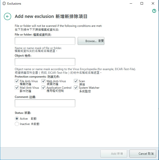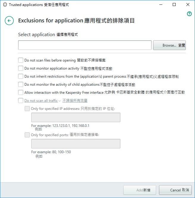 至於受信任應用程式點進去如果要新增會出現如下畫面(畫面跟管理排除項目相似所以不附圖),一樣按瀏覽選擇目標程式,以下附加選項依需求勾選。