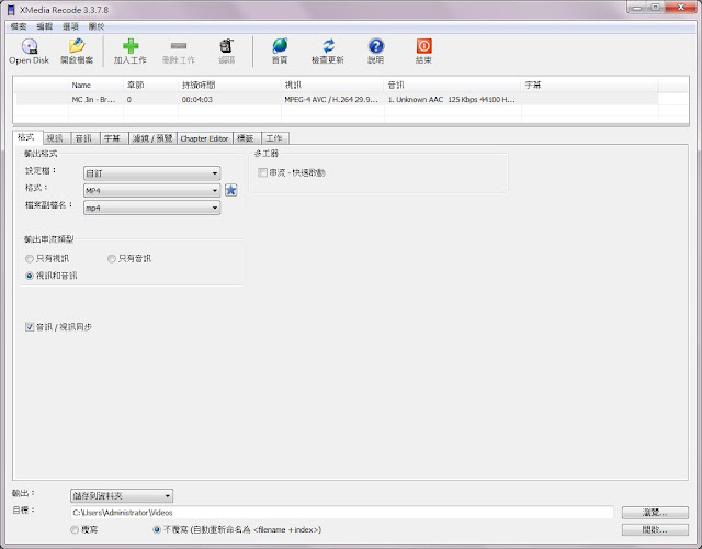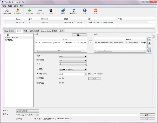 XMedia Recode 這個免費的轉檔軟體可以實現影片音量標準化,有需要的朋友請自取但誤盜連