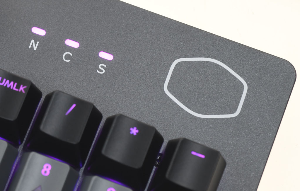 ▼右上方有Cooler Master標誌,標誌左方有Num Lock(N)、Caps Lock(C)、Scr Lock(S)指示燈,其燈色也會隨著鍵盤背光顏色改變