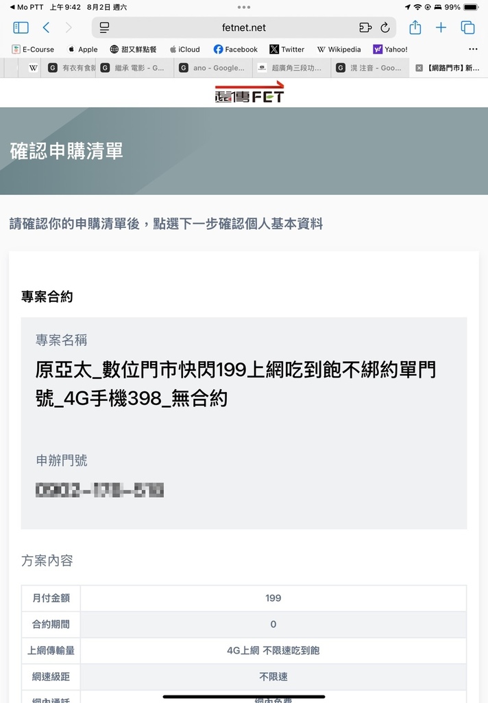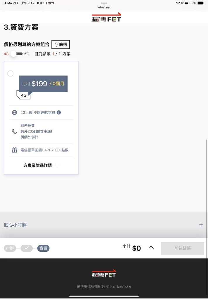 我們以鞭擊老 G 持有的 月租199 不綁約吃到飽方案為例