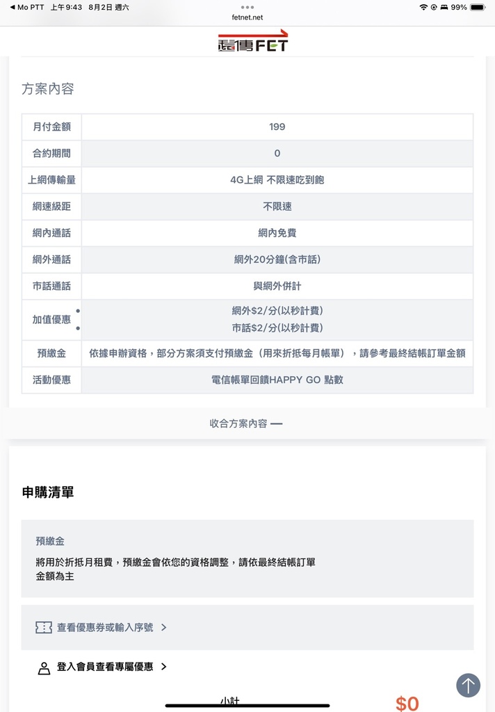 像是老G的門號就跳出了跟原本一樣的199不綁約吃到飽方案