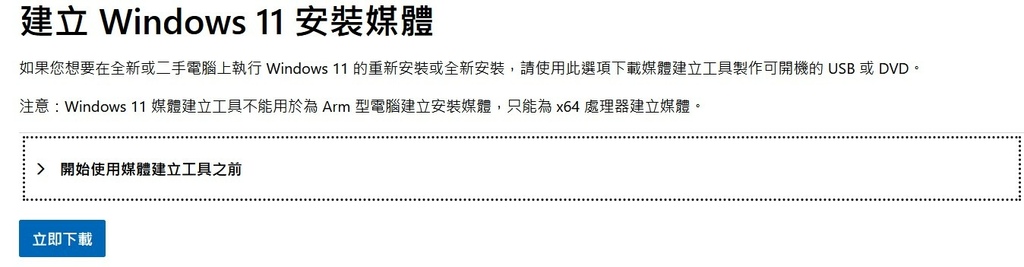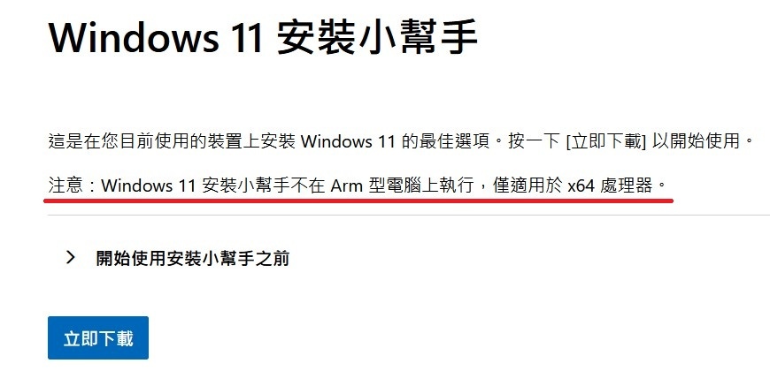 要注意的 ~~~ Windows 11 安裝小幫手不在 Arm 型電腦上執行,僅適用於 x64 處理器