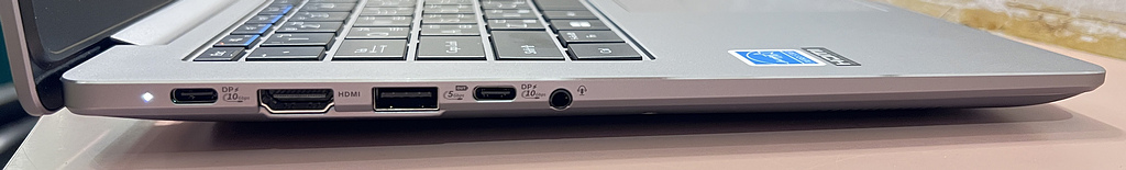 Left side: Power/charge light, 2x USB 3.2 Gen 2 Type-C (full-featured), USB 3.2 Gen 1 Type-A, HDMI 2.1 (TMDS) - audio jack.