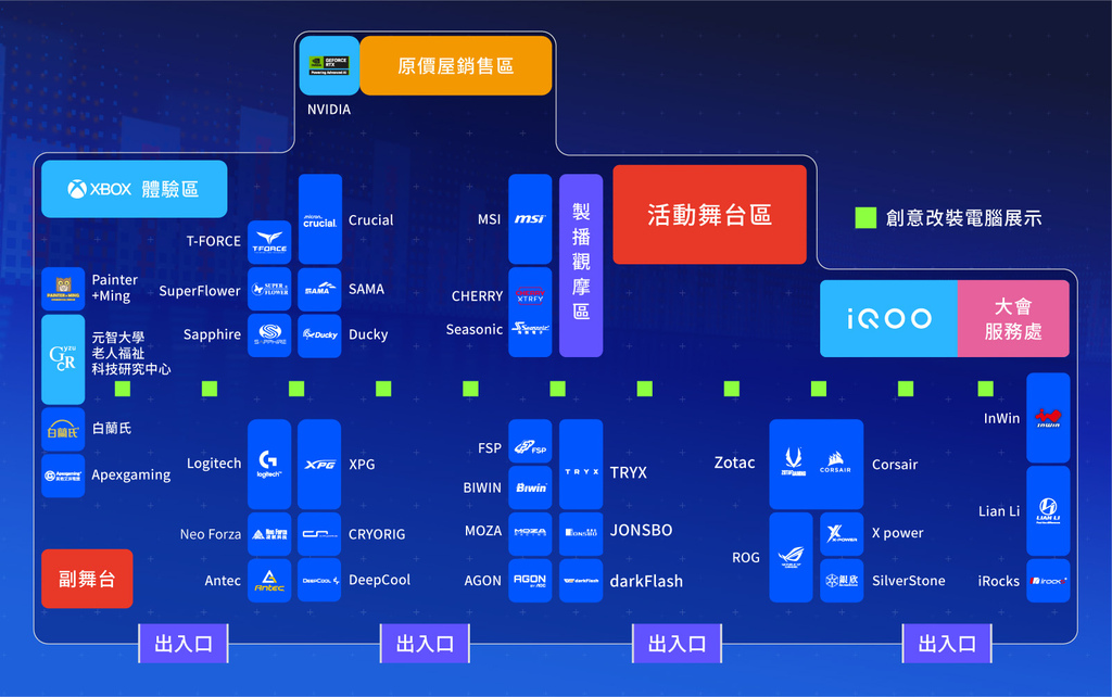 展出品牌攤位:原價屋、NVIDIA、IQOO、XBOX、InWin、LIAN LI、iRocks、Corsair、ZOTAC、X-Power、SilverStone、ROG、TRYX、JONSBO、darkFlash、MSI、CHERRY、Seasonic、FSP、BIWIN、MOZA RACING、AGON、Crucial、SAMA、Ducky、XPG、CRYORIG、Deepcool、T-FORCE、SUPER FLOWER、Sapphire、Logitech G、Neo Forza、Antec、PAINTER+MING、Apexgaming、白蘭氏、世大智科